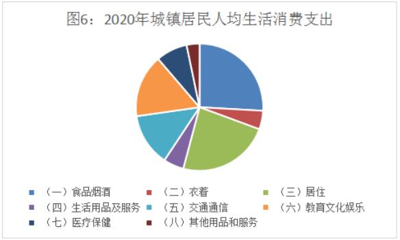 居民可支配收入的增長促進了居民消費水平的提高,2020 年我區城鎮居民生活消費支出達到 41805 元,居民生活質量不斷提高。從支出的八大類型看,食品消費支出增長 2%,衣著消費支出下降 5.1%,居住消費支出增長 7%,生活用品及服務消費支出增長 7.5%,交通通信消費支出增長 9.8%,教育文化娛樂消費支出下降 14.9%,醫療保健消費支出下降 4.6%,其他用品和服務下降 4%。