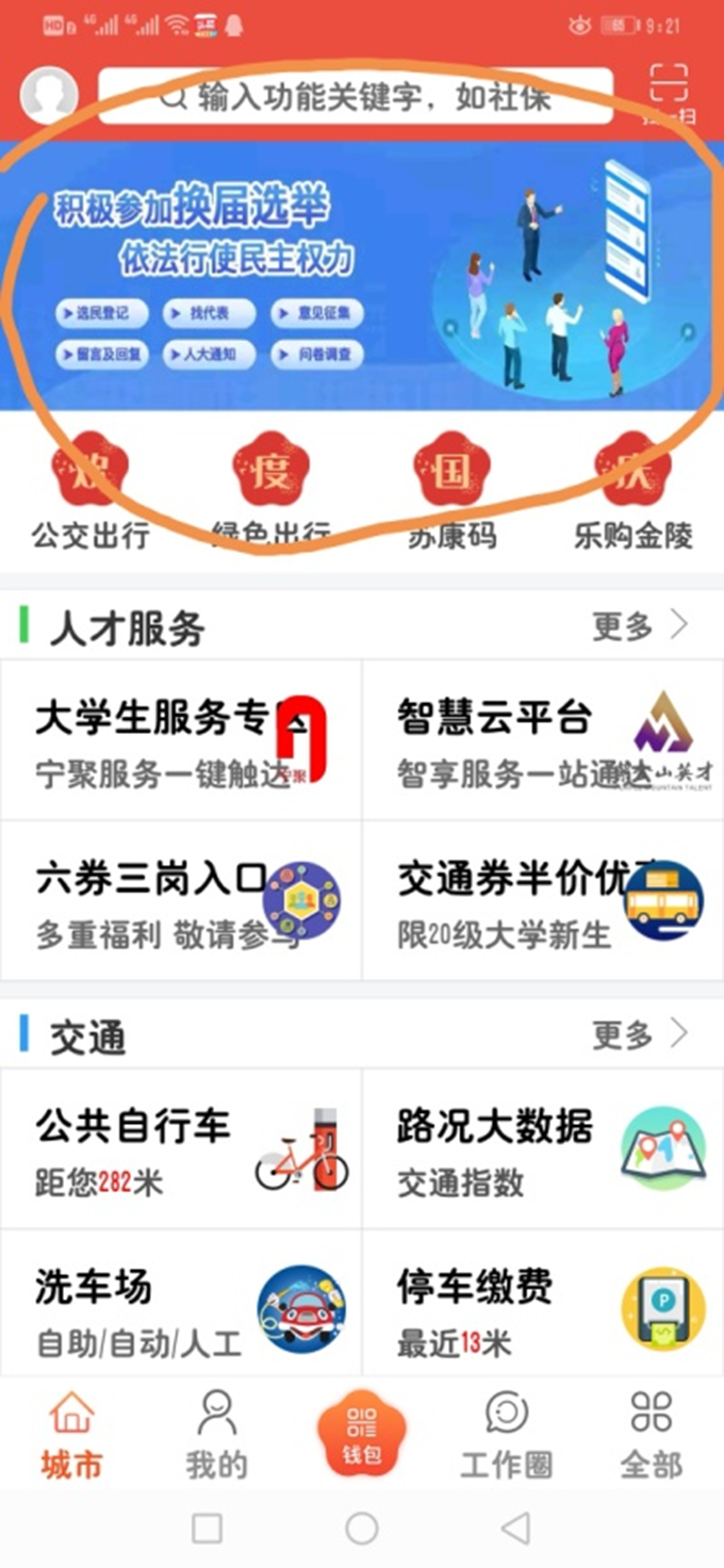 一、打開“我的南京”APP,找到積極參加換屆選舉,點進入。