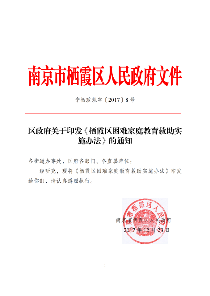 寧棲政規(guī)字〔2017〕8號 區(qū)政府關(guān)于印發(fā)《棲霞區(qū)困難家庭教育救助實(shí)施辦法》的通知(已蓋章).pdf