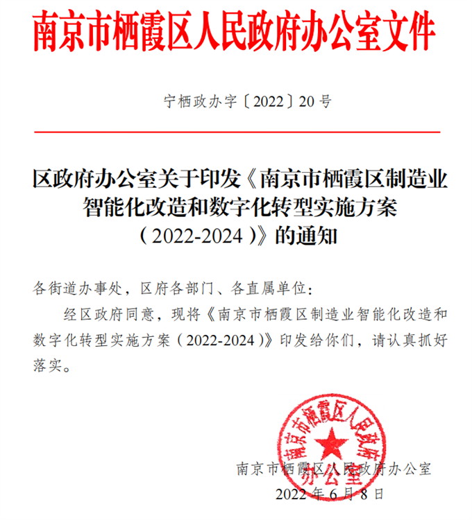 寧棲政辦字〔2022〕20號 區政府辦公室關于印發《南京市棲霞區制造業智能化改造和數字化轉型實施方案(2022-2024)》的通知