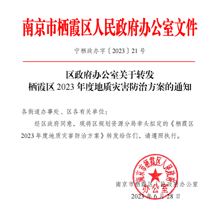 寧棲政辦字〔2023〕21號 區政府辦公室關于轉發棲霞區2023年度地質災害防治工作方案的通知