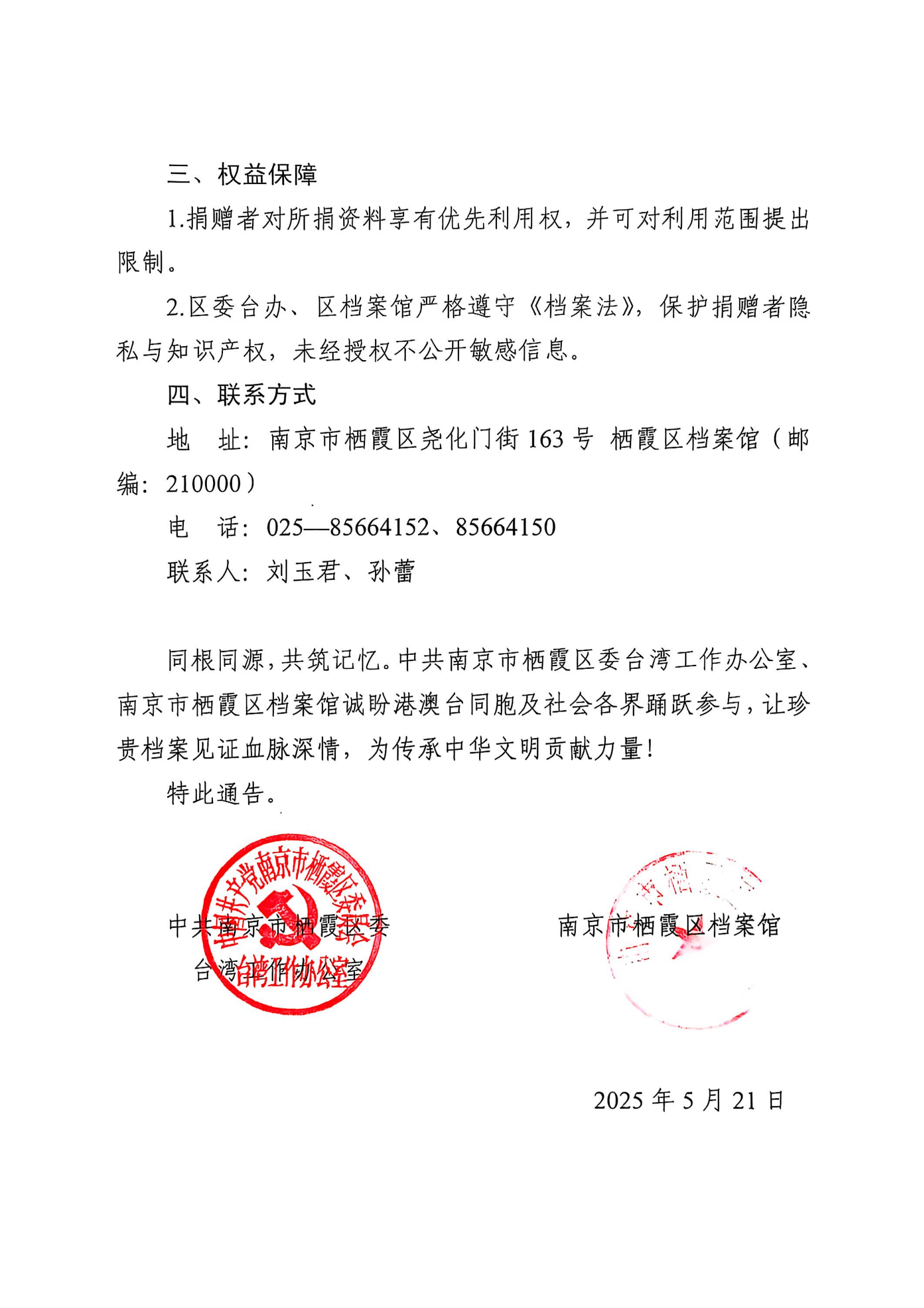 棲霞區委臺辦、棲霞區檔案館關于面向港澳臺同胞征集檔案資料的通告
