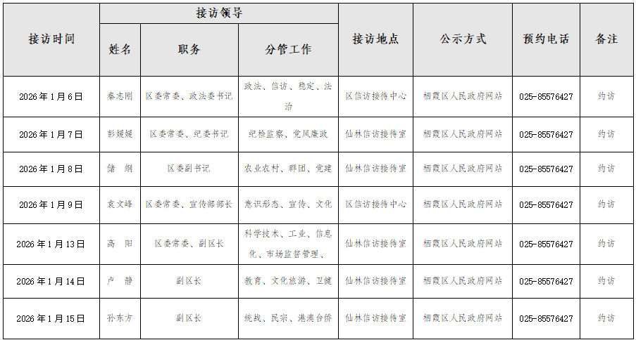 棲霞區(qū)2026年1月黨政領(lǐng)導(dǎo)干部接訪日程安排表