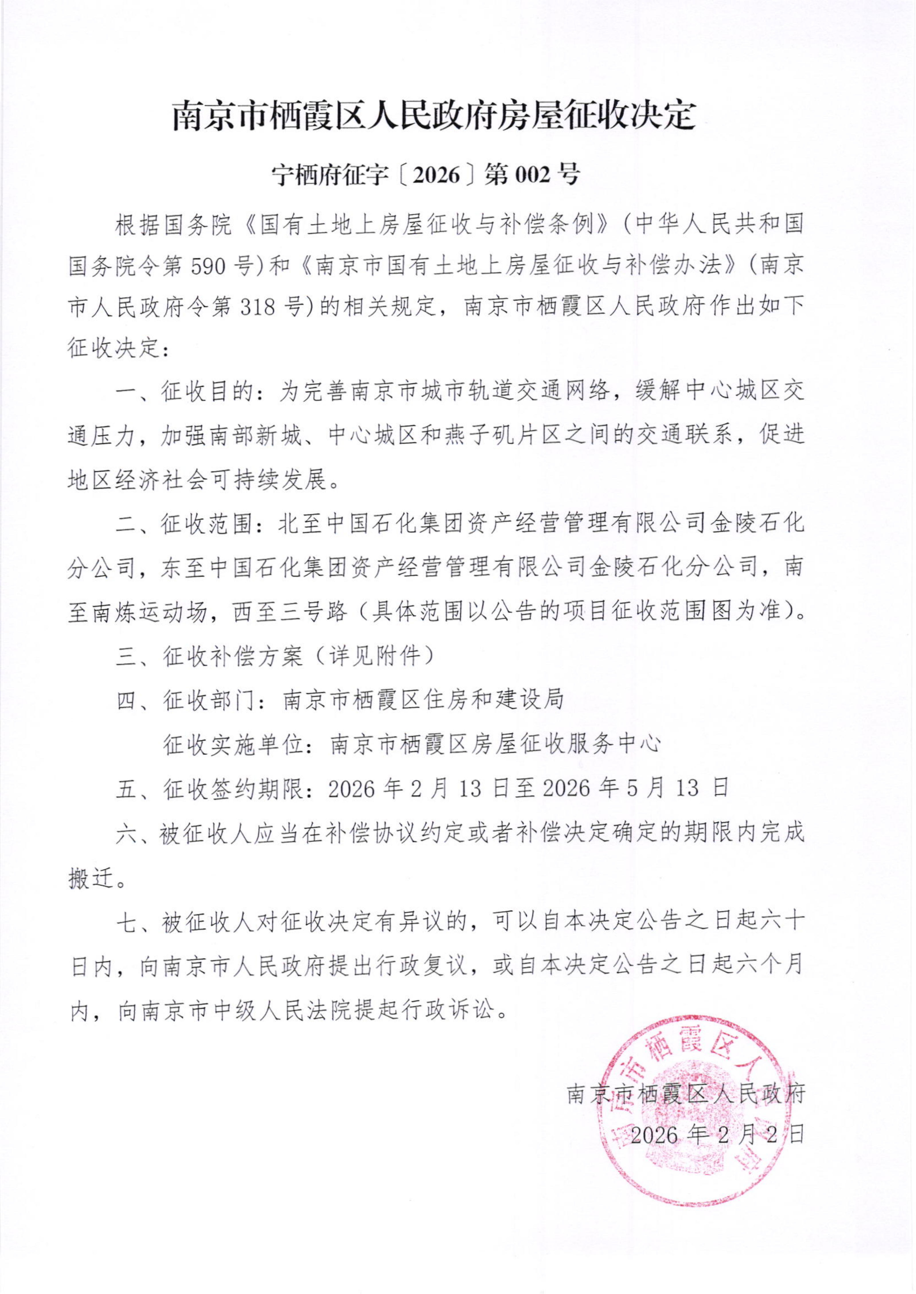 寧棲府征字[2026]第002號 南京市棲霞區人民政府房屋征收決定