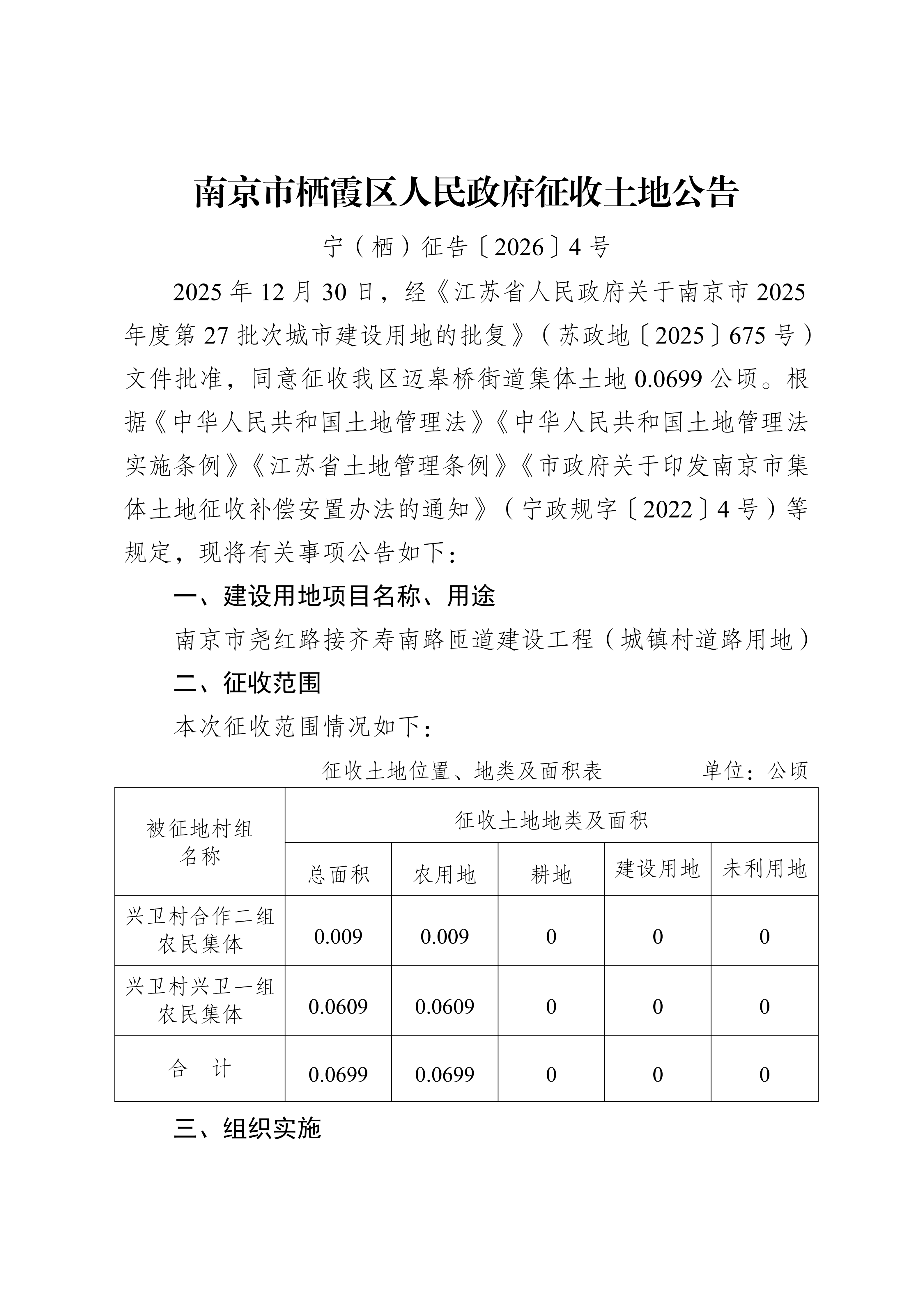 征收土地公告-寧(棲)征告〔2026〕4號(hào)-南京市堯紅路接齊壽南路匝道建設(shè)工程