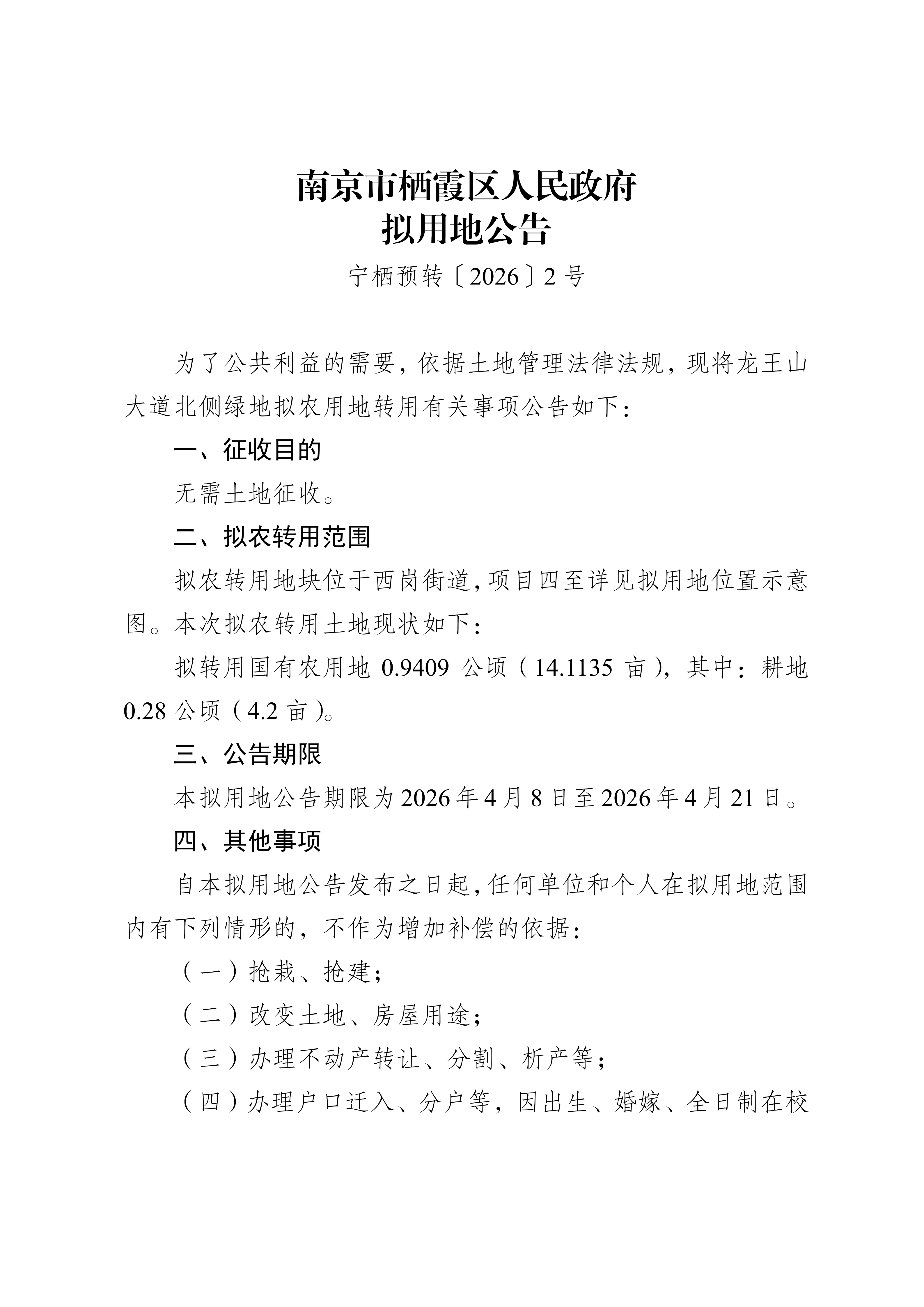 信息名稱:    寧棲預轉〔2026〕2號-龍王山大道北側綠地