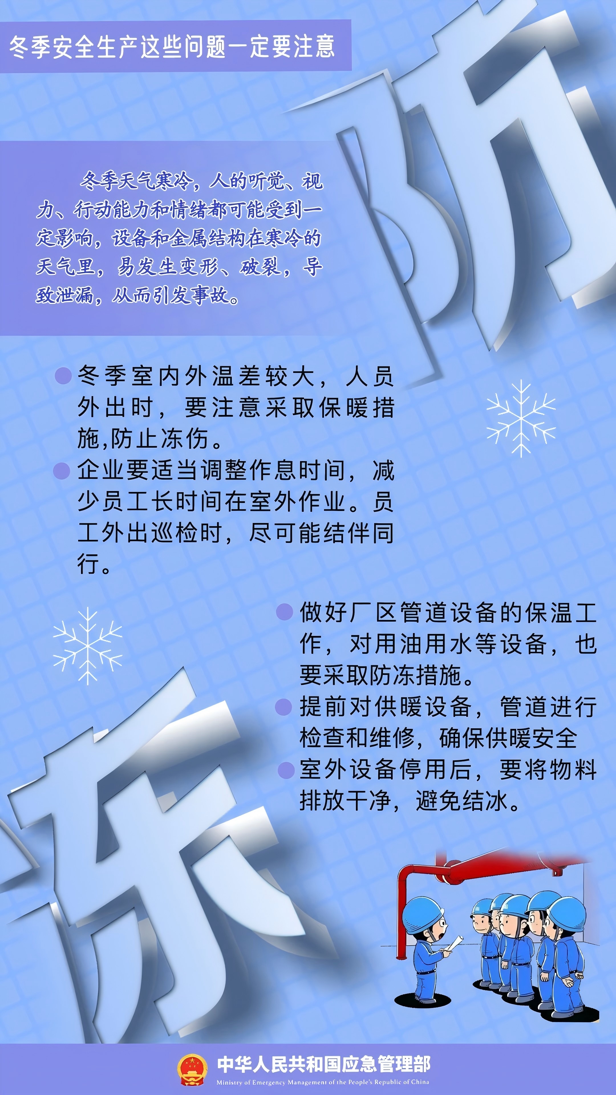 立冬時節,氣溫驟降、氣象多變,隨著冬季用火、用電、用氣量的增加,以及各生產經營單位作業現場不安全因素的增多,導致火災及生產安全事故易發多發,冬季安全生產這些問題,企業一定要注意!