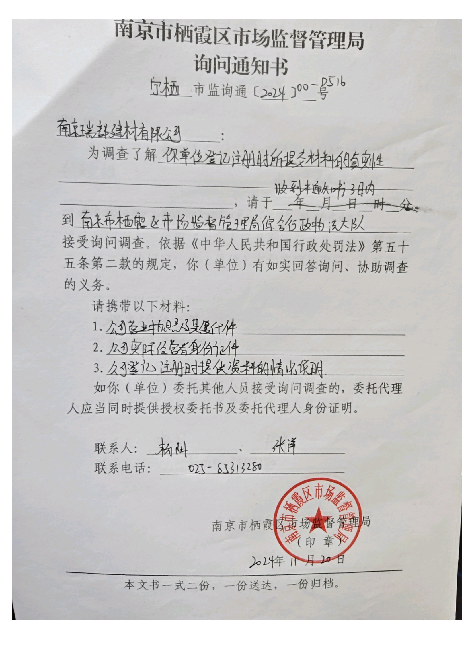 南京市棲霞區(qū)市場監(jiān)督管理局詢問通知書(南京瑞部建材有限公司)