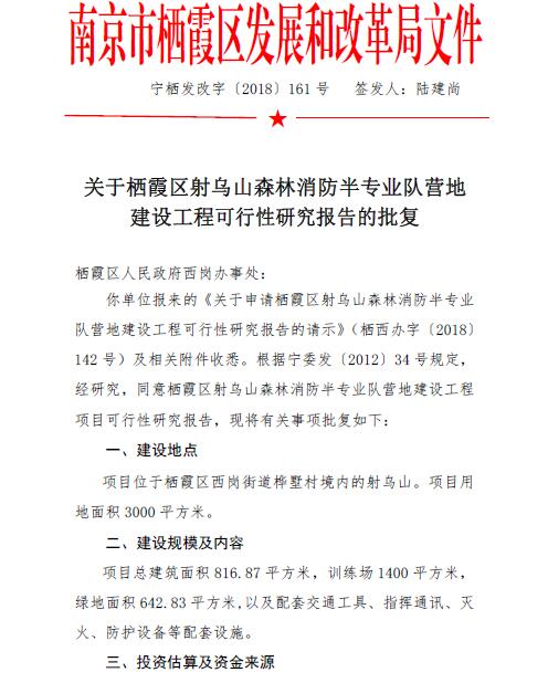 寧棲發(fā)改字〔2018〕161號 關(guān)于棲霞區(qū)射烏山森林消防半專業(yè)隊(duì)營地建設(shè)工程可行性研究報告的批復(fù).pdf