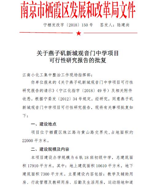 寧棲發改字〔2018〕150號 關于燕子磯新城觀音門中學項目可行性研究報告的批復.pdf