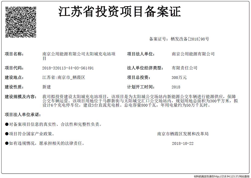 信息名稱:    江蘇省投資項(xiàng)目備案證-南京公用能源有限公司太陽(yáng)城充電站項(xiàng)目