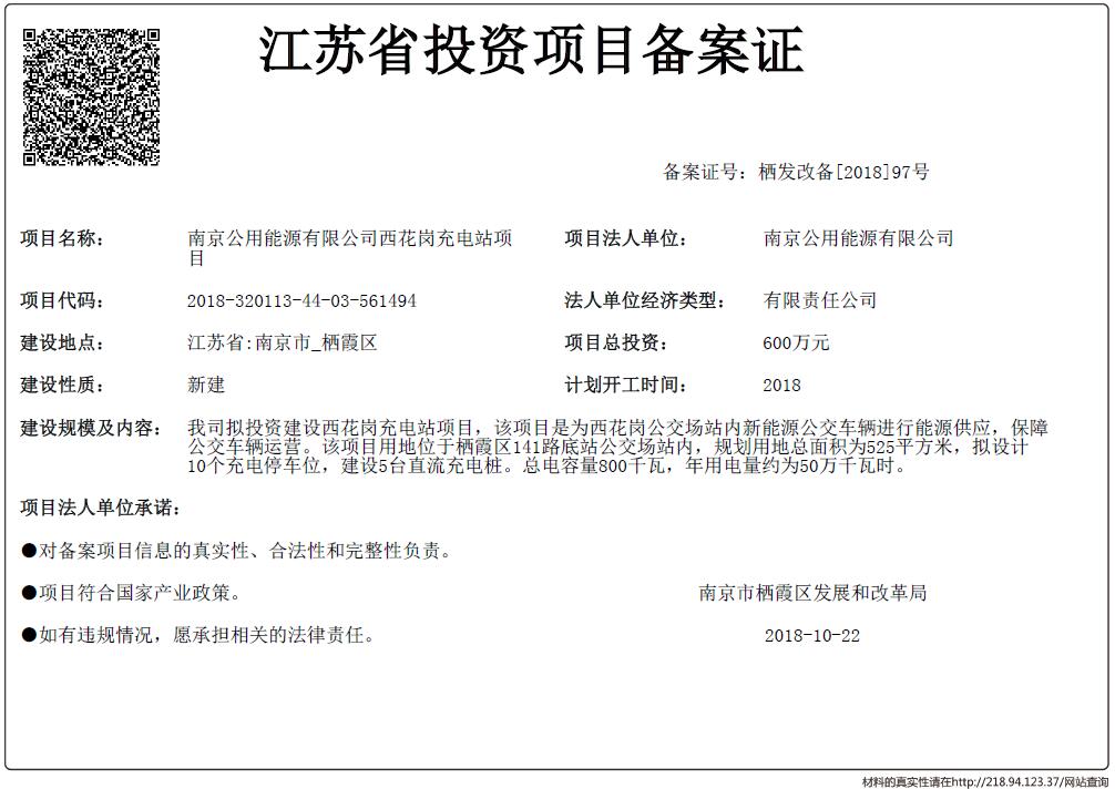 信息名稱:    江蘇省投資項目備案證-南京公用能源有限公司西花崗充電站項目