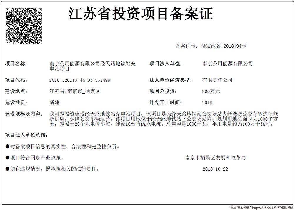 信息名稱:    江蘇省投資項目備案證-南京公用能源有限公司經天路地鐵站充電站項目