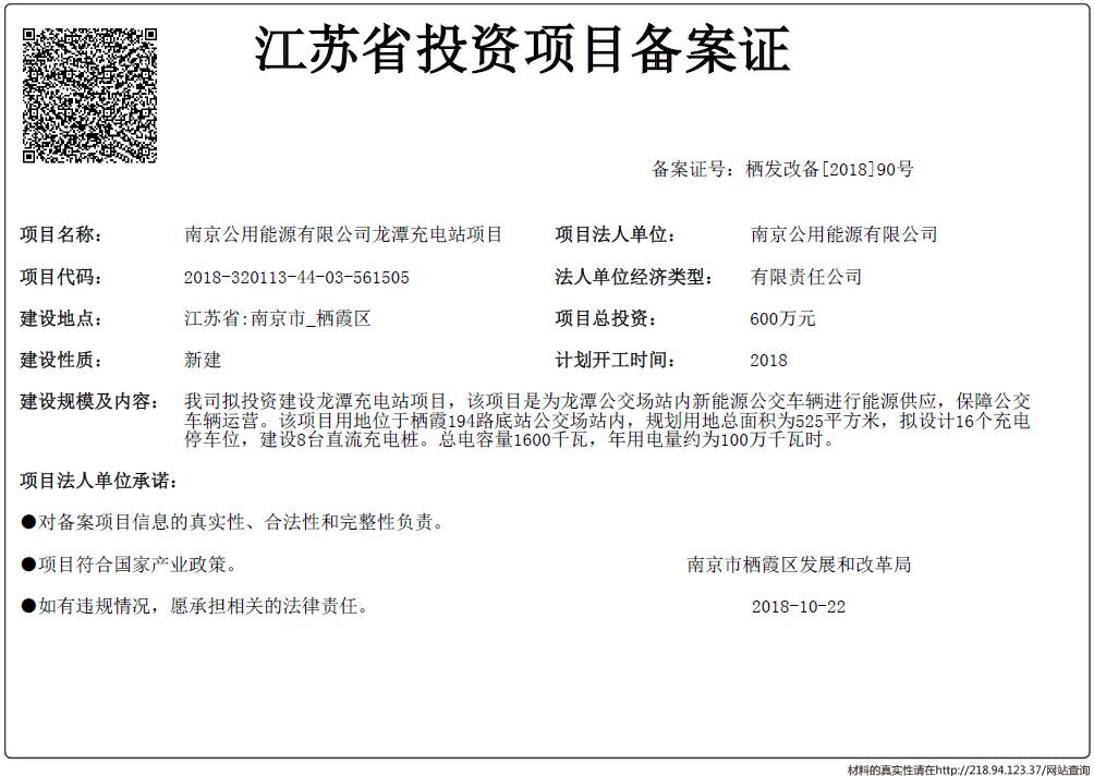 信息名稱:    江蘇省投資項目備案證-南京公用能源有限公司龍潭充電站項目
