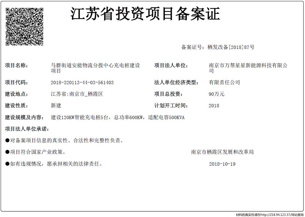 信息名稱:    江蘇省投資項目備案證-馬群街道安能物流分撥中心充電樁建設項目