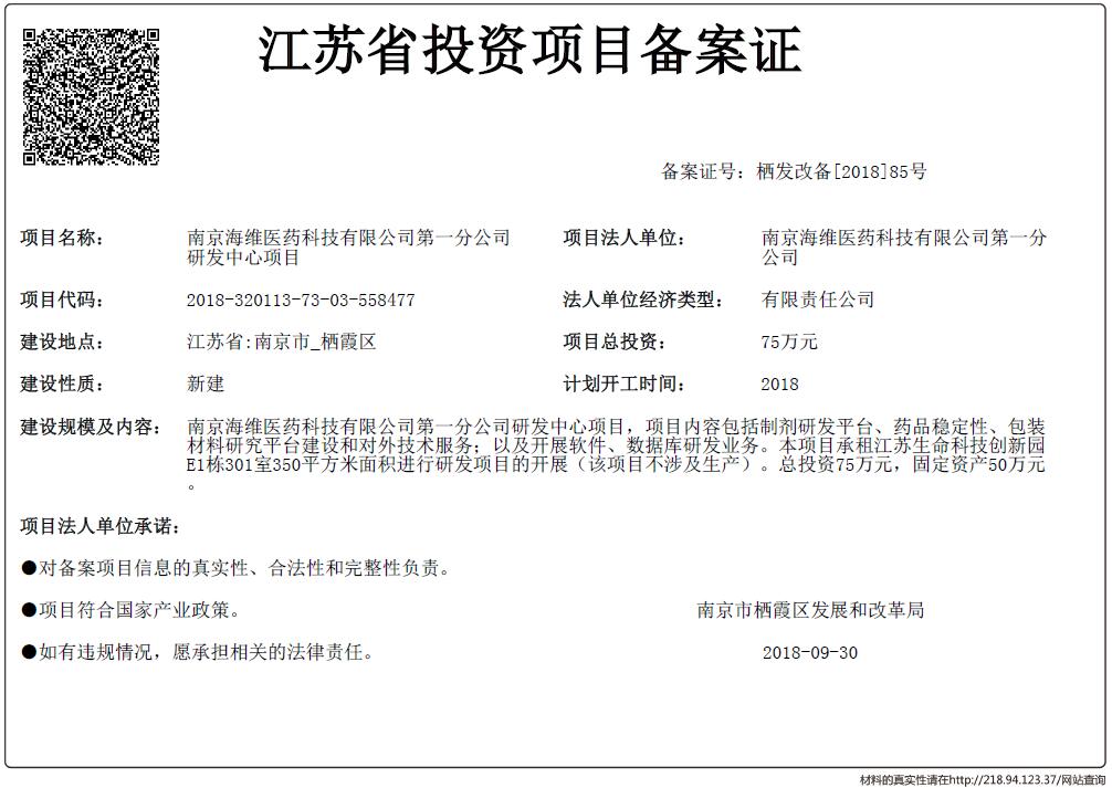 信息名稱:    江蘇省投資項目備案證-南京海維醫藥科技有限公司第一分公司研發中心項目