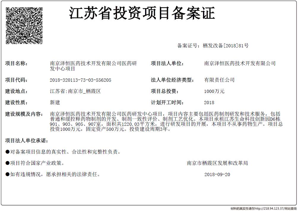 信息名稱:    江蘇省投資項目備案證-南京澤恒醫藥技術開發有限公司醫藥研發中心項目