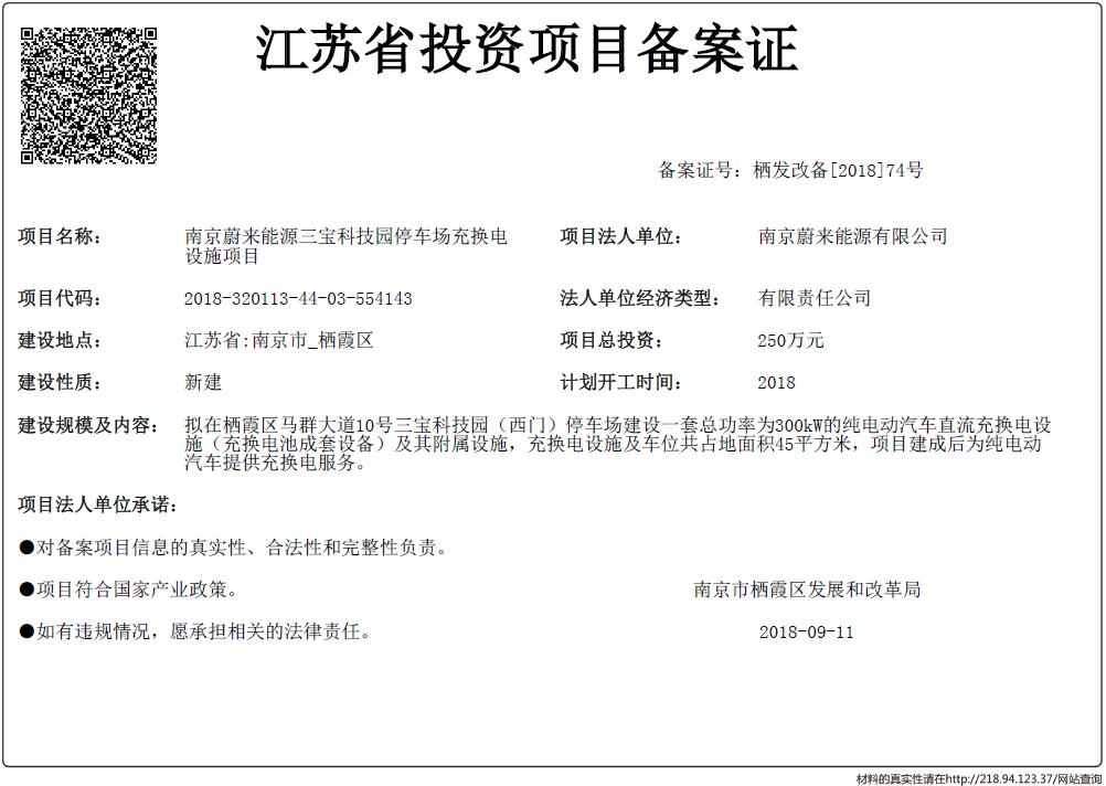 江蘇省投資項(xiàng)目備案證-南京蔚來(lái)能源三寶科技園停車場(chǎng)充換電設(shè)施項(xiàng)目
