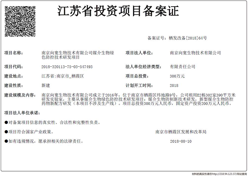 信息名稱:    江蘇省投資項(xiàng)目備案證-南京向?qū)捝锛夹g(shù)有限公司媒介生物綠色防控技術(shù)研發(fā)項(xiàng)目