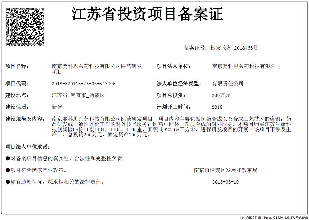 江蘇省投資項目備案證-南京賽科思醫藥科技有限公司醫藥研發項目