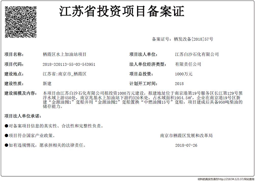 信息名稱:    江蘇省投資項目備案證-棲霞區水上加油站項目