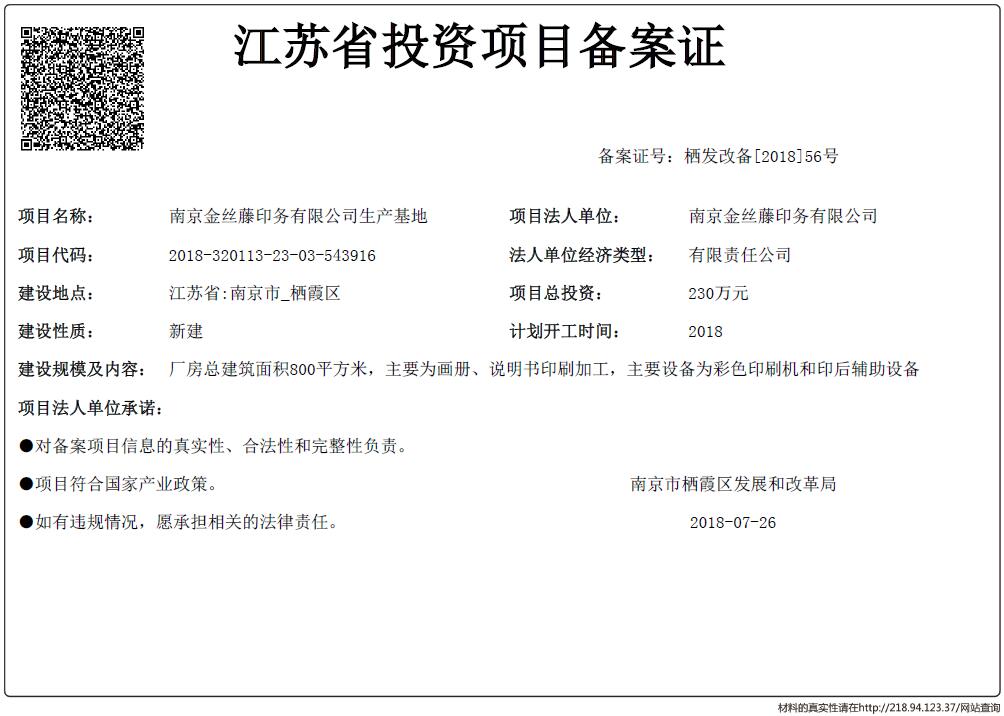 江蘇省投資項目備案證-南京金絲藤印務有限公司生產基地