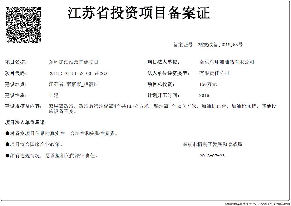 信息名稱:    江蘇省投資項目備案證-東環加油站改擴建項目