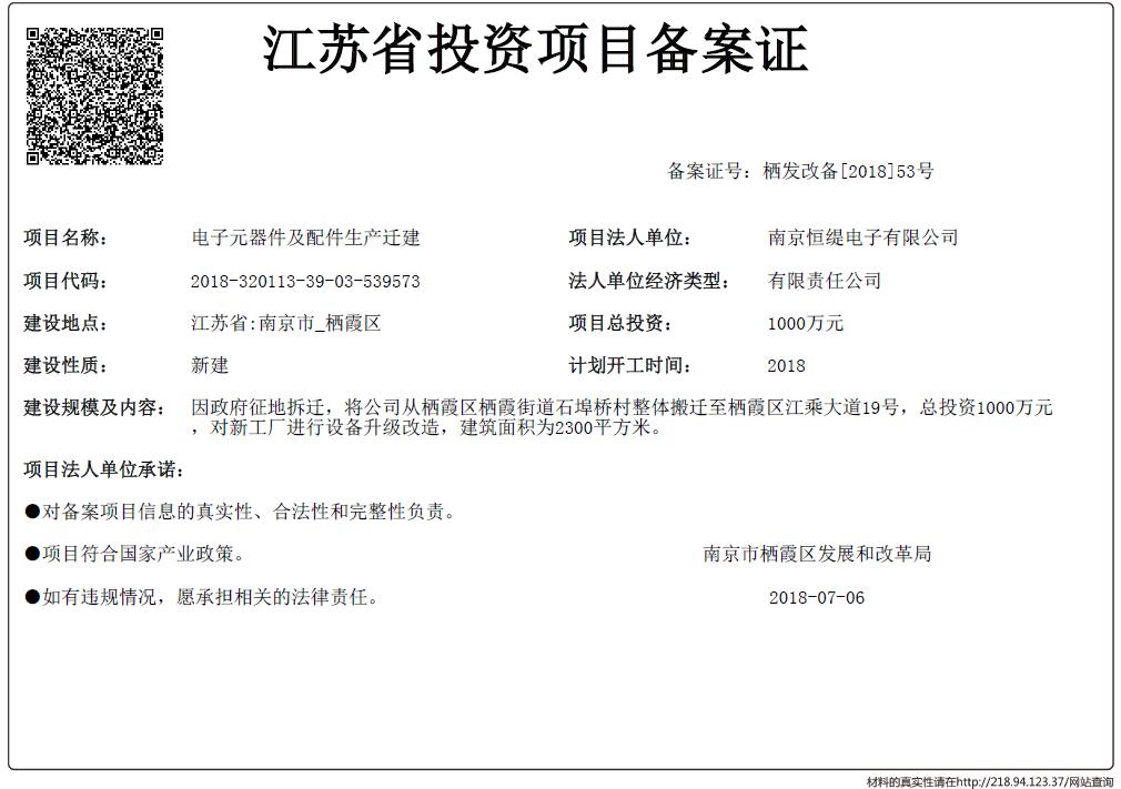 江蘇省投資項目備案證-電子元器件及配件生產遷建