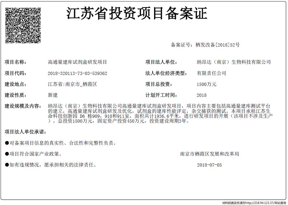 江蘇省投資項(xiàng)目備案證-高通量建庫(kù)試劑盒研發(fā)項(xiàng)目