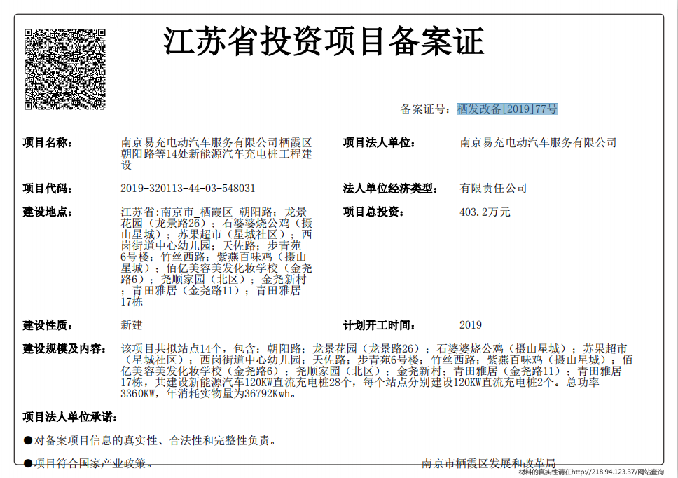 信息名稱:    江蘇省投資項目備案證