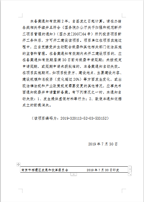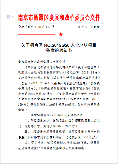 關(guān)于棲霞區(qū)NO.2019G26大全地塊項(xiàng)目備案的通知書(shū)