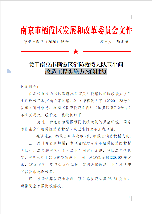 關于南京市棲霞區消防救援大隊衛生間改造工程實施方案的批復