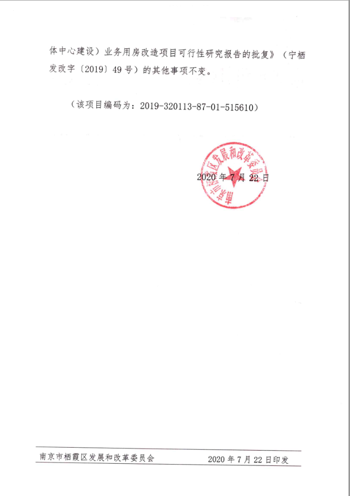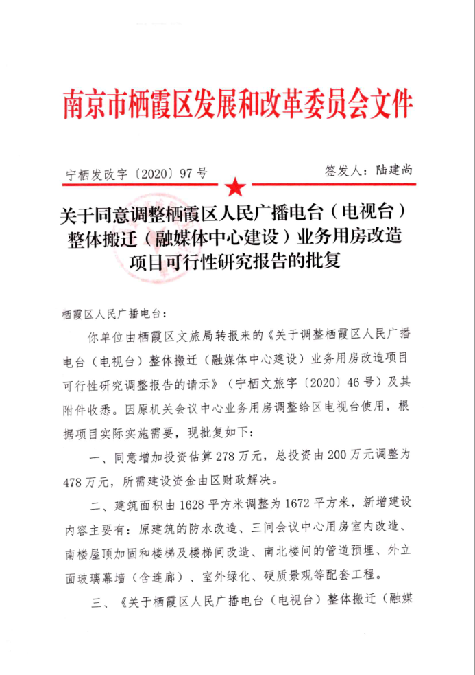 關于棲霞區人民廣播電臺(電視臺)整體搬遷(融媒體中心建設)業務用房改造項目可行性研究報告的批復