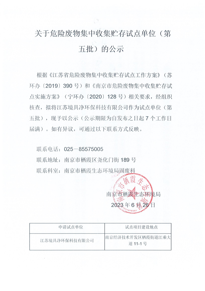 關于危險廢物集中收集貯存試點單位的公示