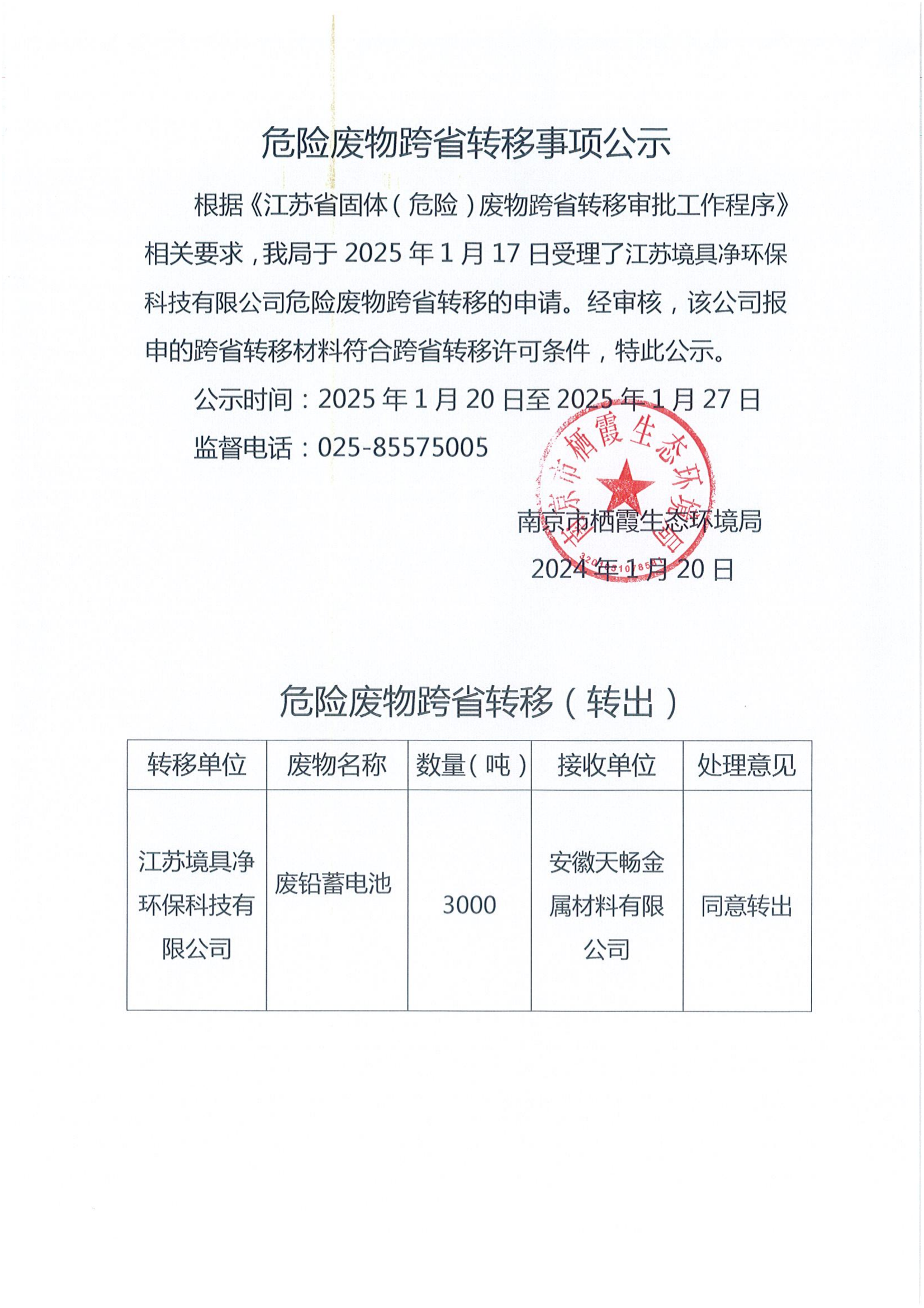 危險廢物跨省轉移事項公示(境具凈-天暢)