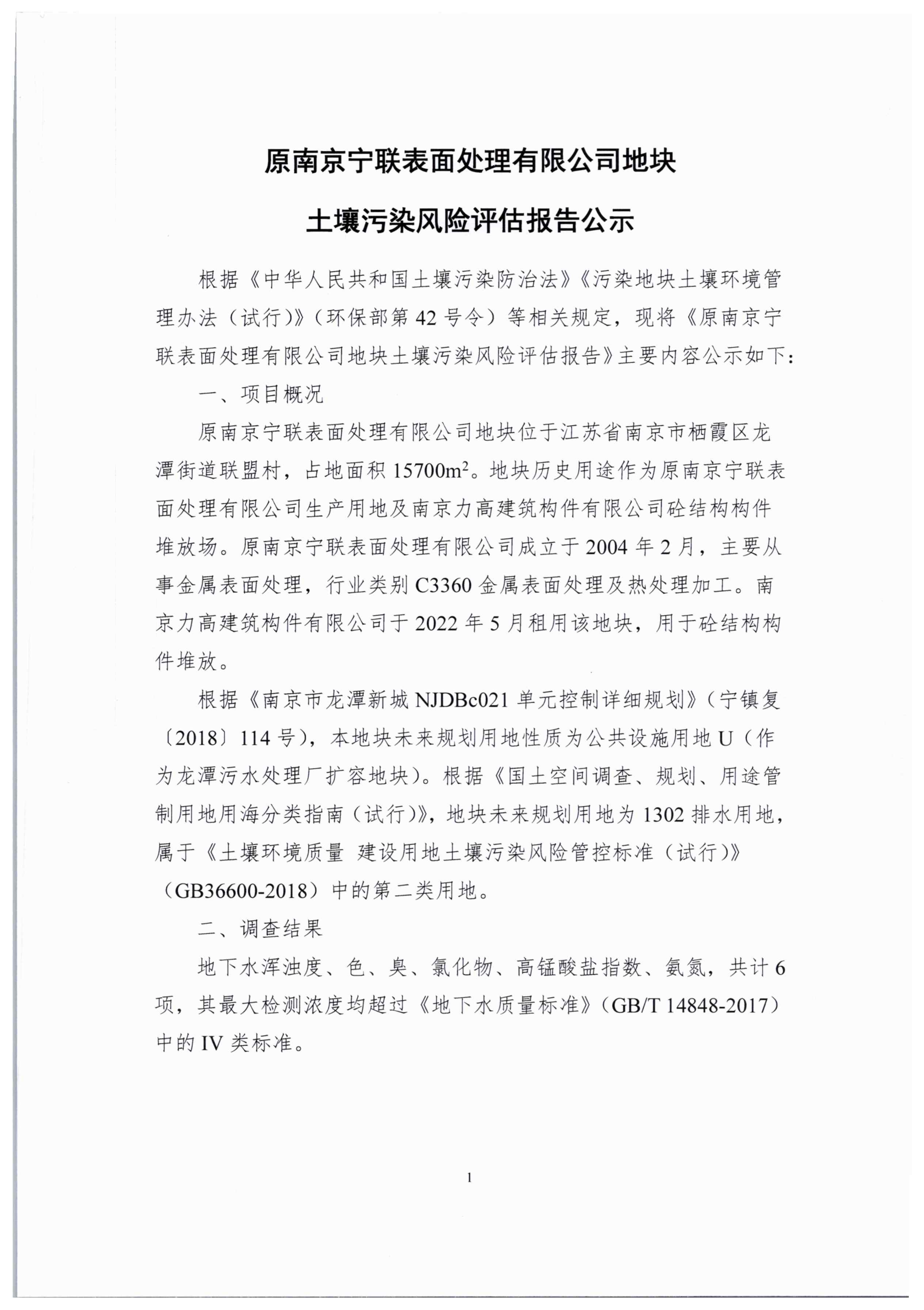 原南京寧聯表面處理有限公司地塊土壤污染風險評估報告公示