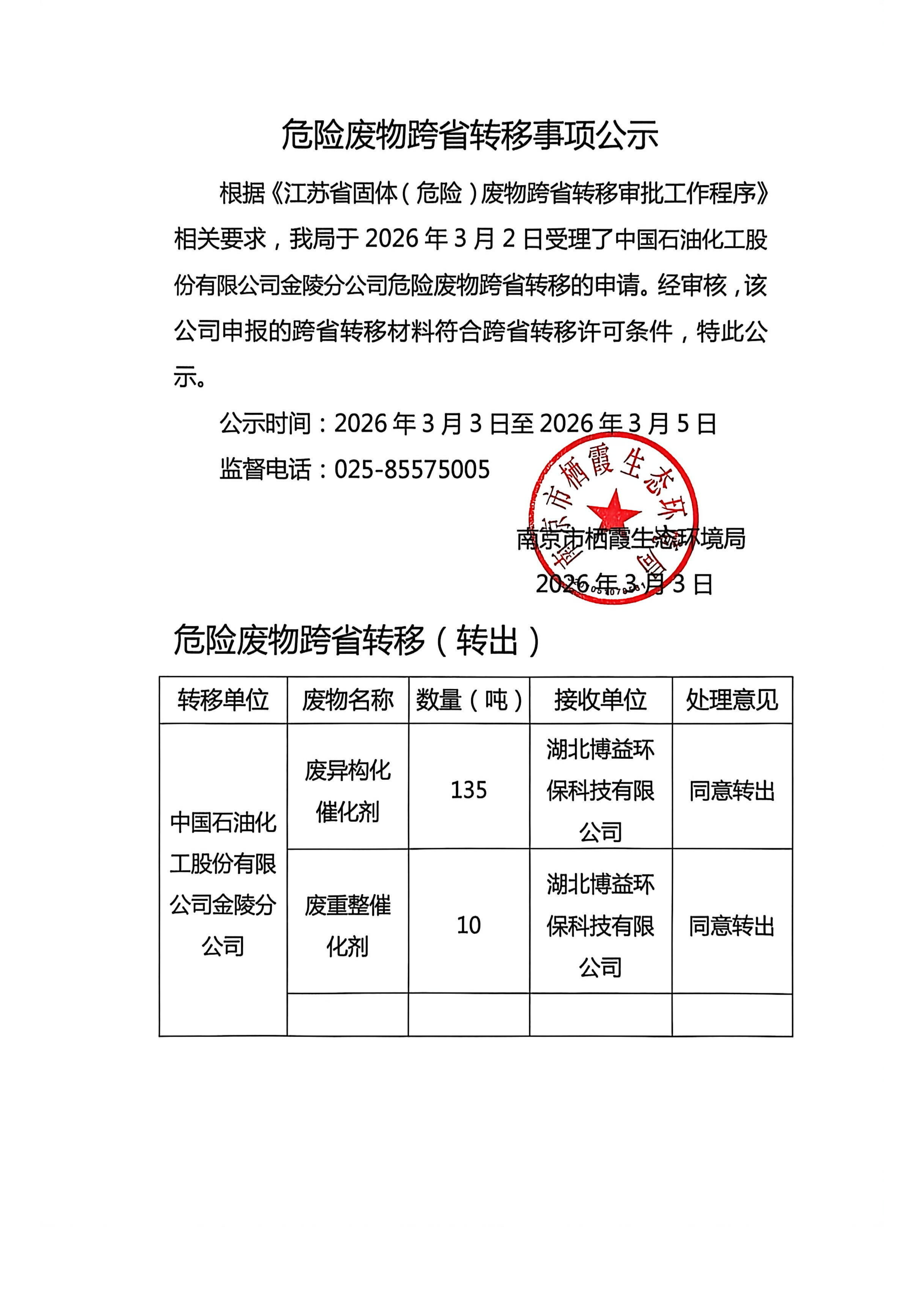 危險(xiǎn)廢物跨省轉(zhuǎn)移事項(xiàng)公示