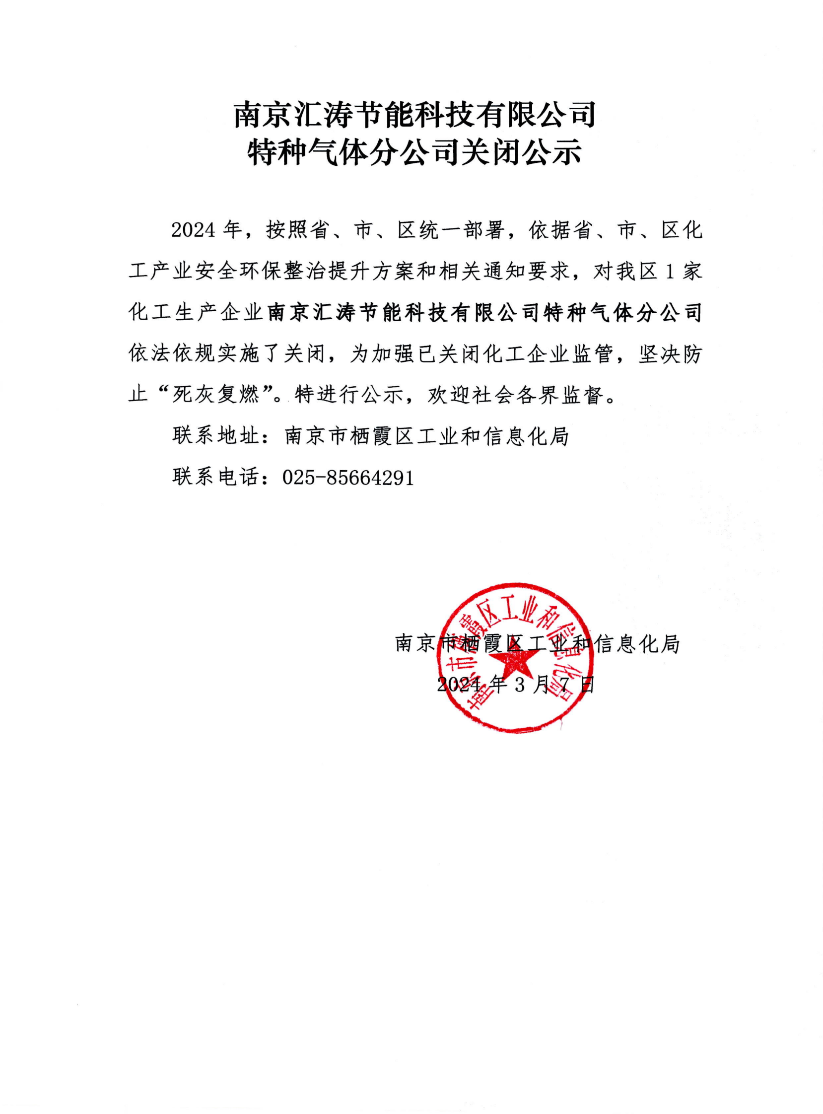 南京匯濤節能科技有限公司特種氣體分公司關閉公示