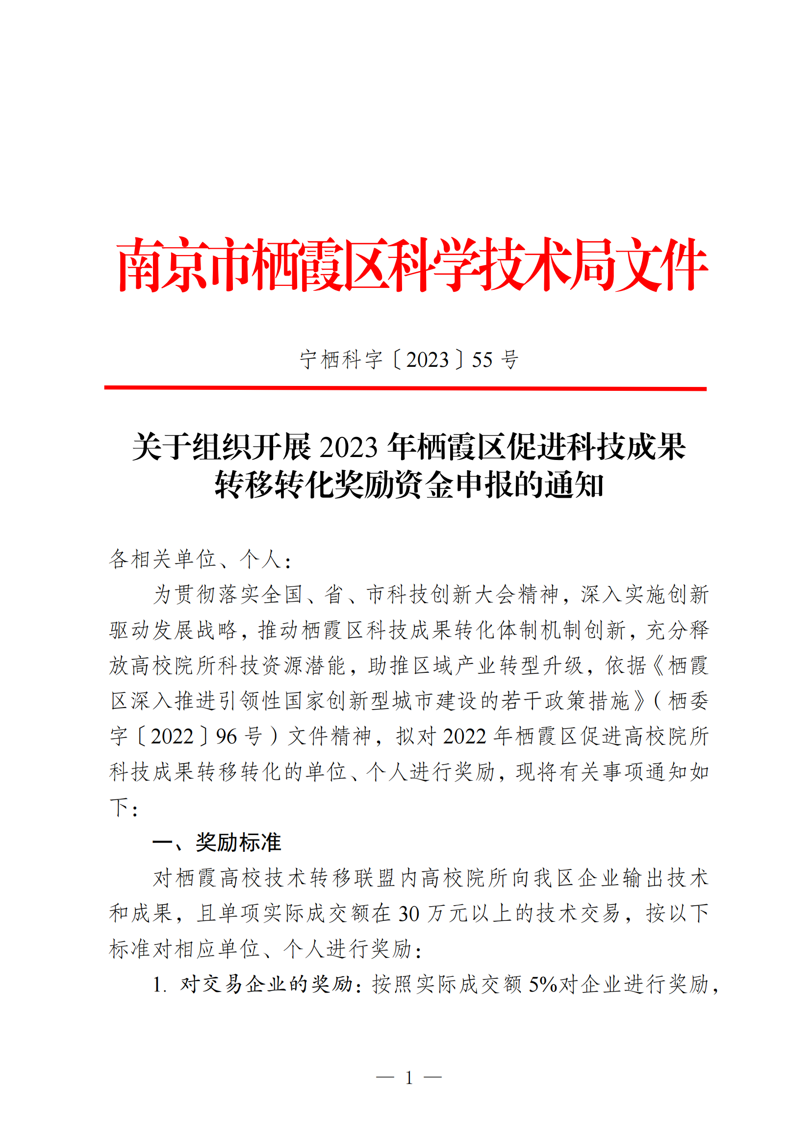 寧棲科字〔2023〕55號(hào) 關(guān)于組織開(kāi)展2023年棲霞區(qū)促進(jìn)科技成果轉(zhuǎn)移轉(zhuǎn)化獎(jiǎng)勵(lì)資金申報(bào)的通知