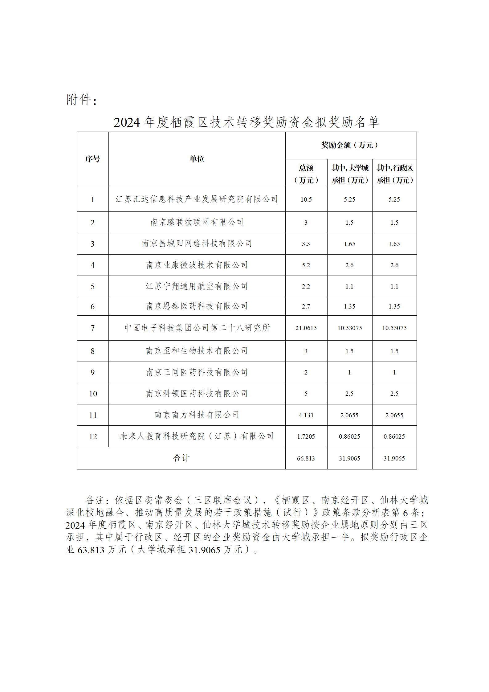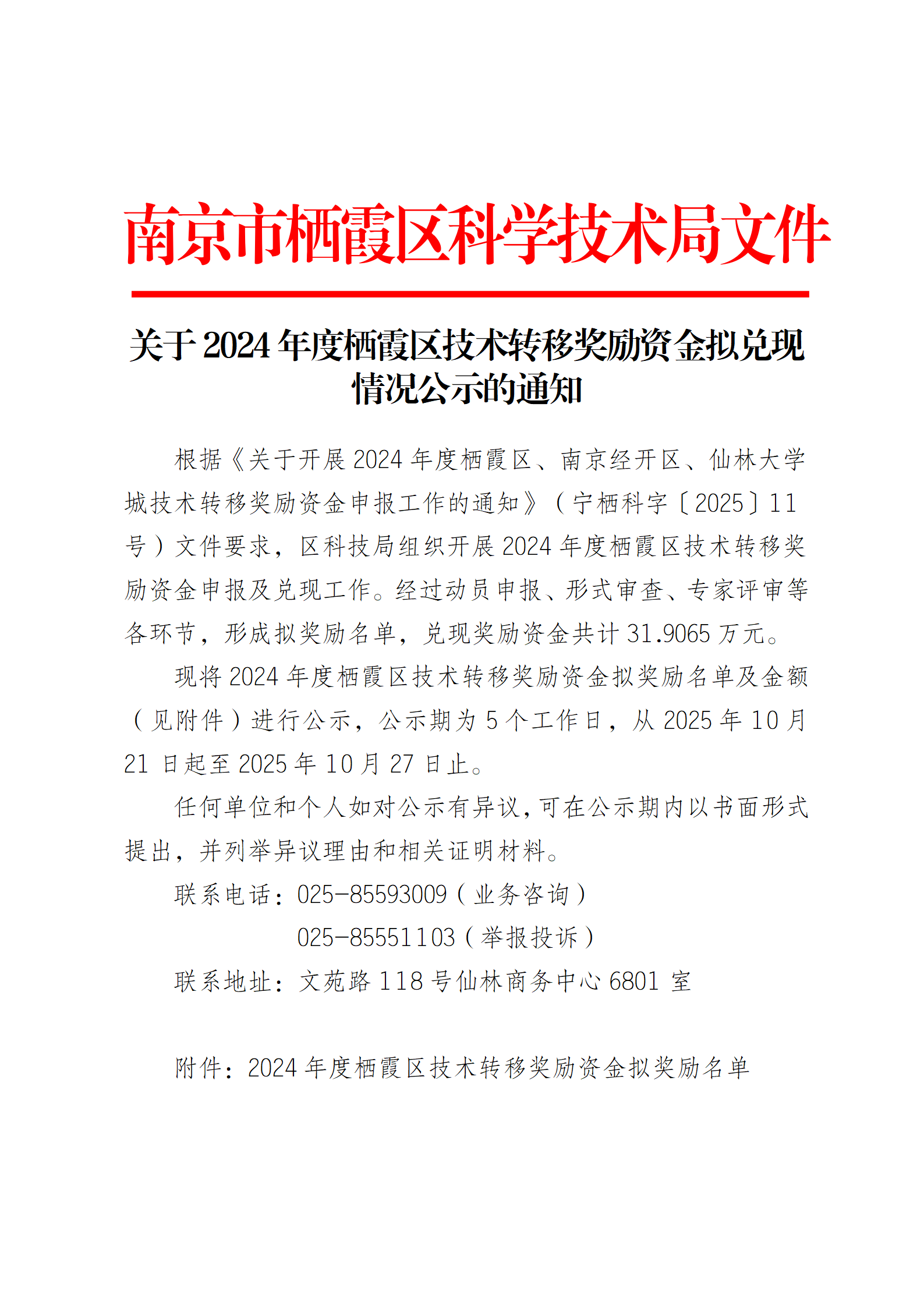關于2024年度棲霞區技術轉移獎勵資金擬兌現情況公示的通知