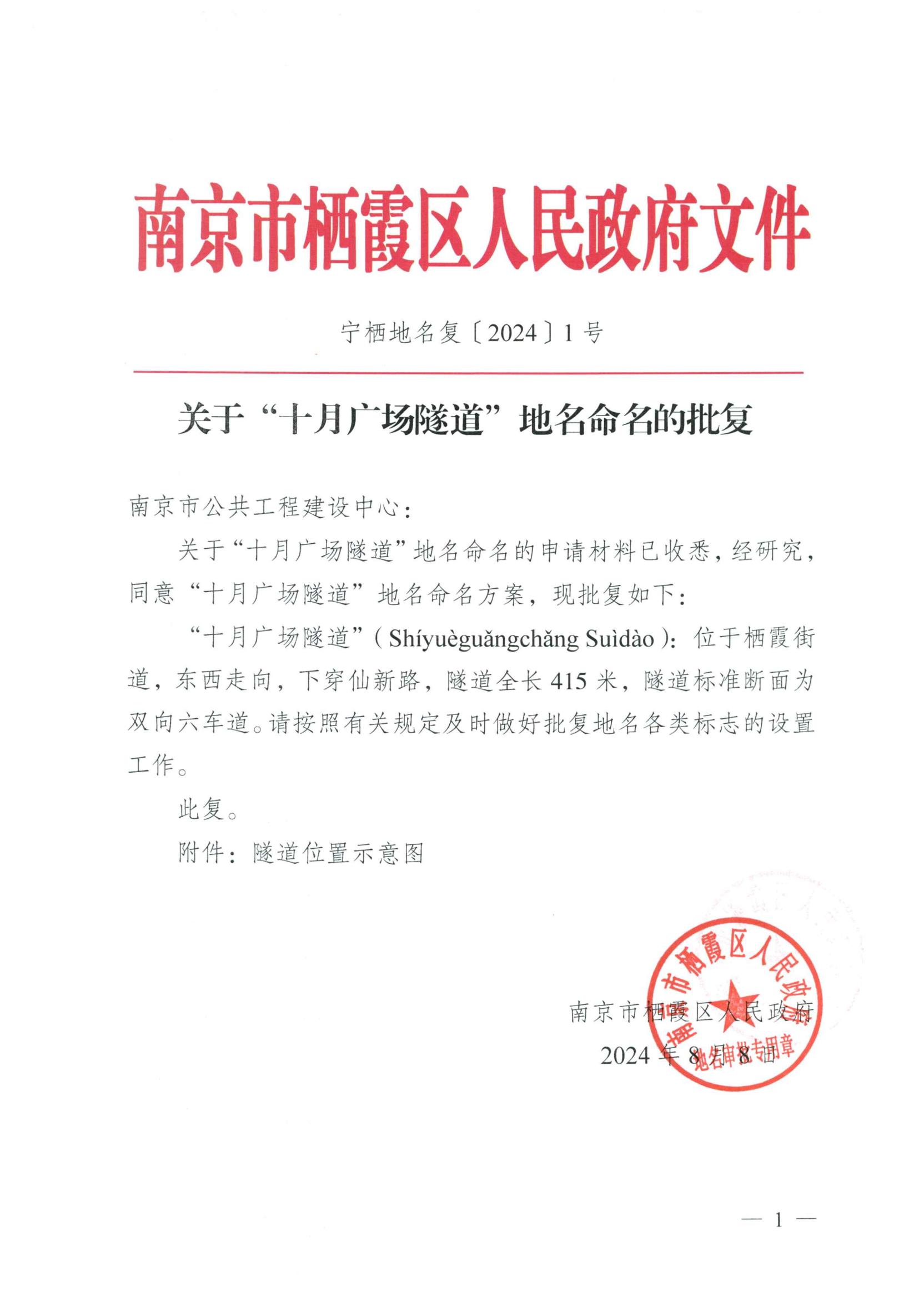 信息名稱:    寧棲地名復〔2024〕1號—關于“十月廣場隧道”地名命名的批復