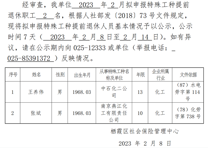 南京市特殊工種提前退休人員情況公示