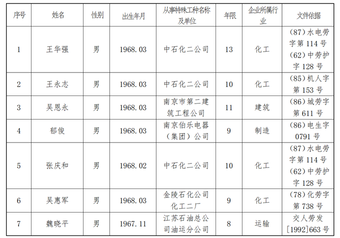 南京市特殊工種提前退休人員情況公示