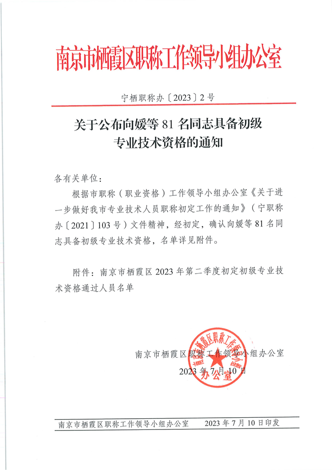 關(guān)于公布向媛等81名同志具備初級(jí)專業(yè)技術(shù)資格的通知