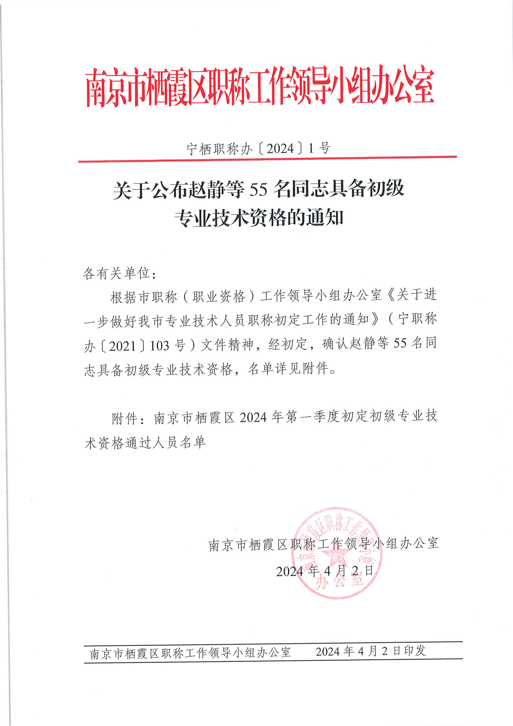 關(guān)于公布趙靜等55名同志具備初級(jí)專(zhuān)業(yè)技術(shù)資格的通知