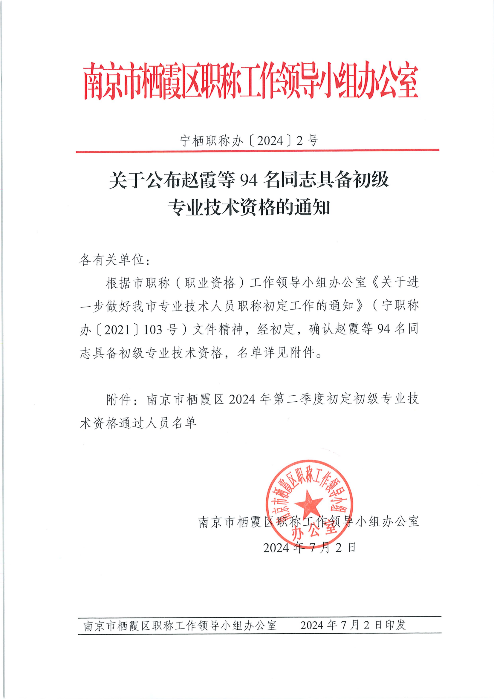 關(guān)于公布趙霞等94名同志具備初級(jí)專業(yè)技術(shù)資格的通知