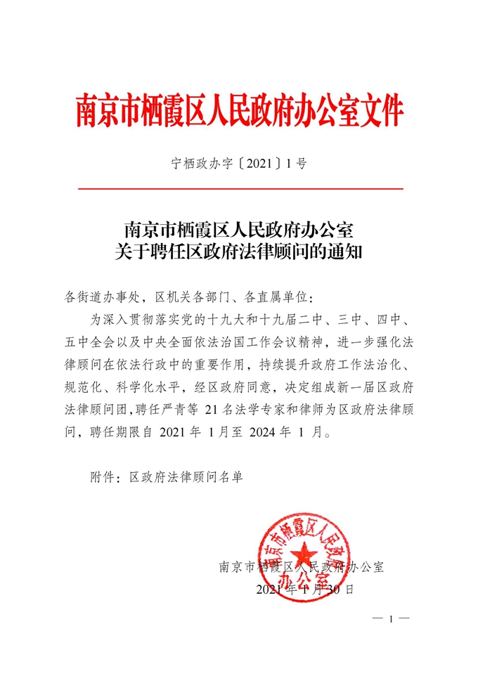 寧棲政辦字〔2021〕1號 南京市棲霞區人民政府辦公室關于聘任區政府法律顧問的通知.pdf