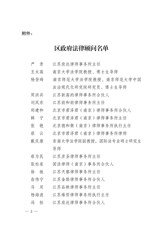 南京市棲霞區人民政府辦公室關于聘任區政府法律顧問的通知