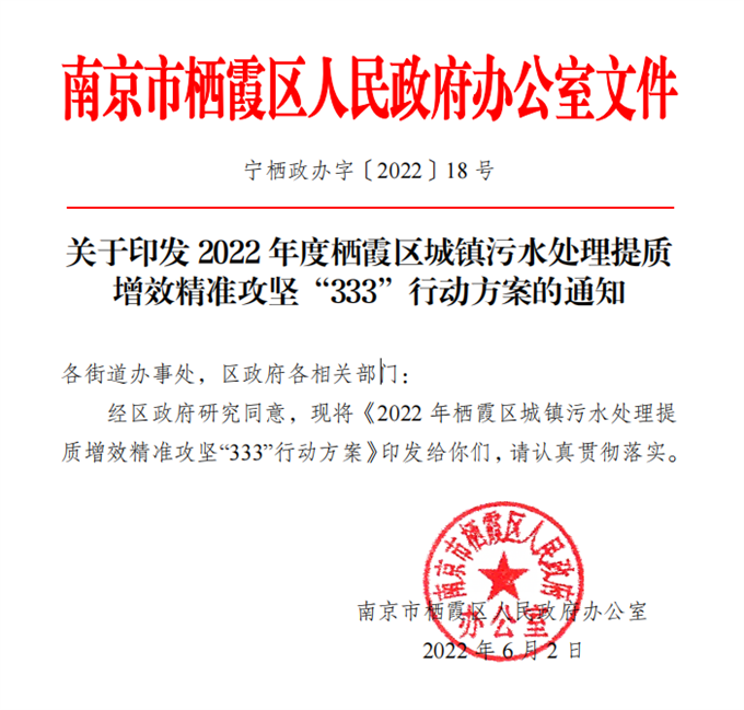 寧棲政辦字〔2022〕18號 關于印發2022年度棲霞區城鎮污水處理提質增效精準攻堅“333”行動方案的通知