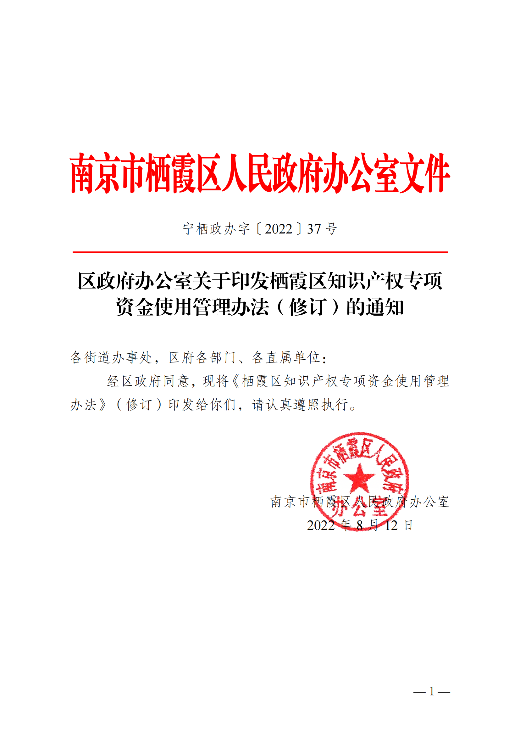 信息名稱:    寧棲政辦字〔2022〕37號 關于印發《棲霞區知識產權專項資金使用管理辦法》的通知